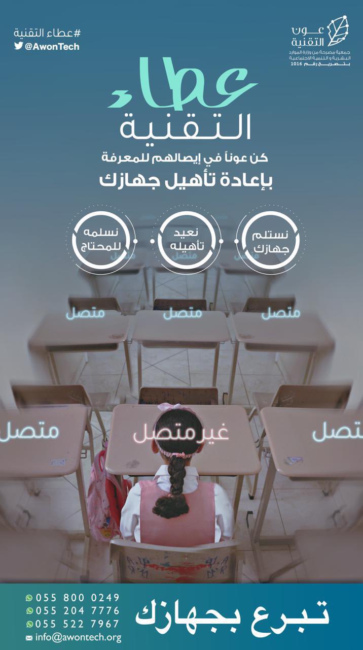 في خطوة تهدف إلى تحقيق التكاتف الاجتماعي، أطلقت جمعية عون التقنية مبادرة "عطاء التقنية" لتأهيل الأجهزة وتسليمها إلى المستفيدين من الطلاب والطالبات من الأسر المتعففة ليكملوا مسيرتهم التعليمية عن بعد.